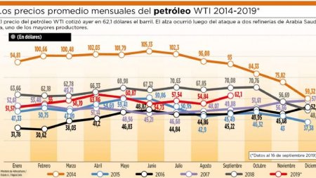 Datos históricos de la cotización muestran que en 2014 el precio del barril estaba por encima de los 105 dólares. Luego, en 2015, registró un promedio de 49 dólares, parecido al de 2017. El año pasado subió hasta los 70 dólares; no obstante, en lo que va de este año no superó la barrera de los 63,86 dólares, registrados en abril. Ayer cerró en 62,1 dólares.